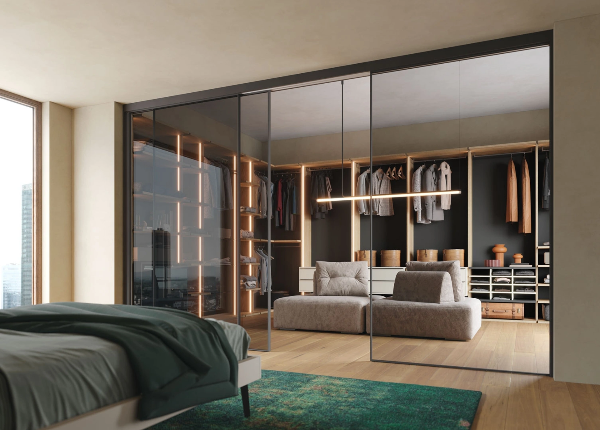 La cabina armadio Nemesi, firmata Giessegi, si distingue per la sua struttura a mezza spalla e un design estremamente rigoroso, dominato da sfumature cromatiche del grigio. L'integrazione di un'illuminazione a LED sui fianchi e la calda finitura in Rovere Nodato mitigano l'imponenza del grigio Fumo, infondendo un'atmosfera luminosa e un'estetica ispirata al minimalismo scandinavo. Le opzioni per i frontali dei cassetti includono diverse tipologie di vetro (Zebrino, Tigrato, Scuro) o le innovative superfici in cannetè laccato Fenix Ultra-Matt (disponibile nelle tonalità Seta, Canvas, Greenstone, Peltro, Fumo). L'accesso è facilitato da un'elegante anta scorrevole, dotata di telaio in alluminio verniciato Grafite e pannello in vetro Reflex. Scegliere questa soluzione d'arredo significa investire in un prodotto di elevata qualità costruttiva e design innovativo, garantendo prestazioni e durabilità nel tempo.