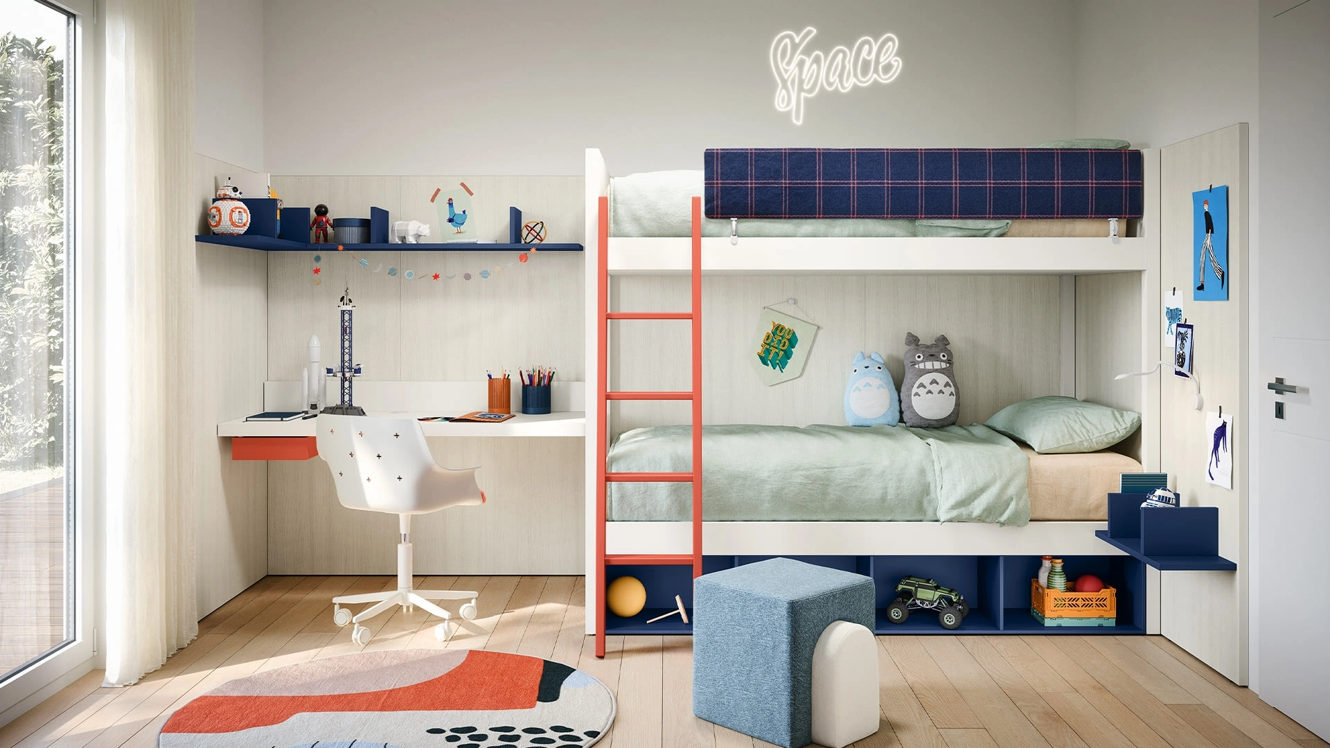 Nell'arredo della stanza dei giovani affidati a noi: nel nostro punto vendita presentiamo tutte le più originali composizioni arredative moderne per la loro camera. Nidi dispone di un ricco catalogo di accessori da comporre su misura: troverai letto, guardaroba, scrivania, sedie e librerie. Porta design e cromie vivaci nella stanza dedicata ai più giovani con questa soluzione, una tra le Camerette con letti a castello per bambini di Nidi. Se cerchi spunti progettuali per decorare alla perfezione la stanza dei tuoi figli, ti presentiamo la Cameretta con letti a castello Camelot di Nidi con finitura in melaminico.