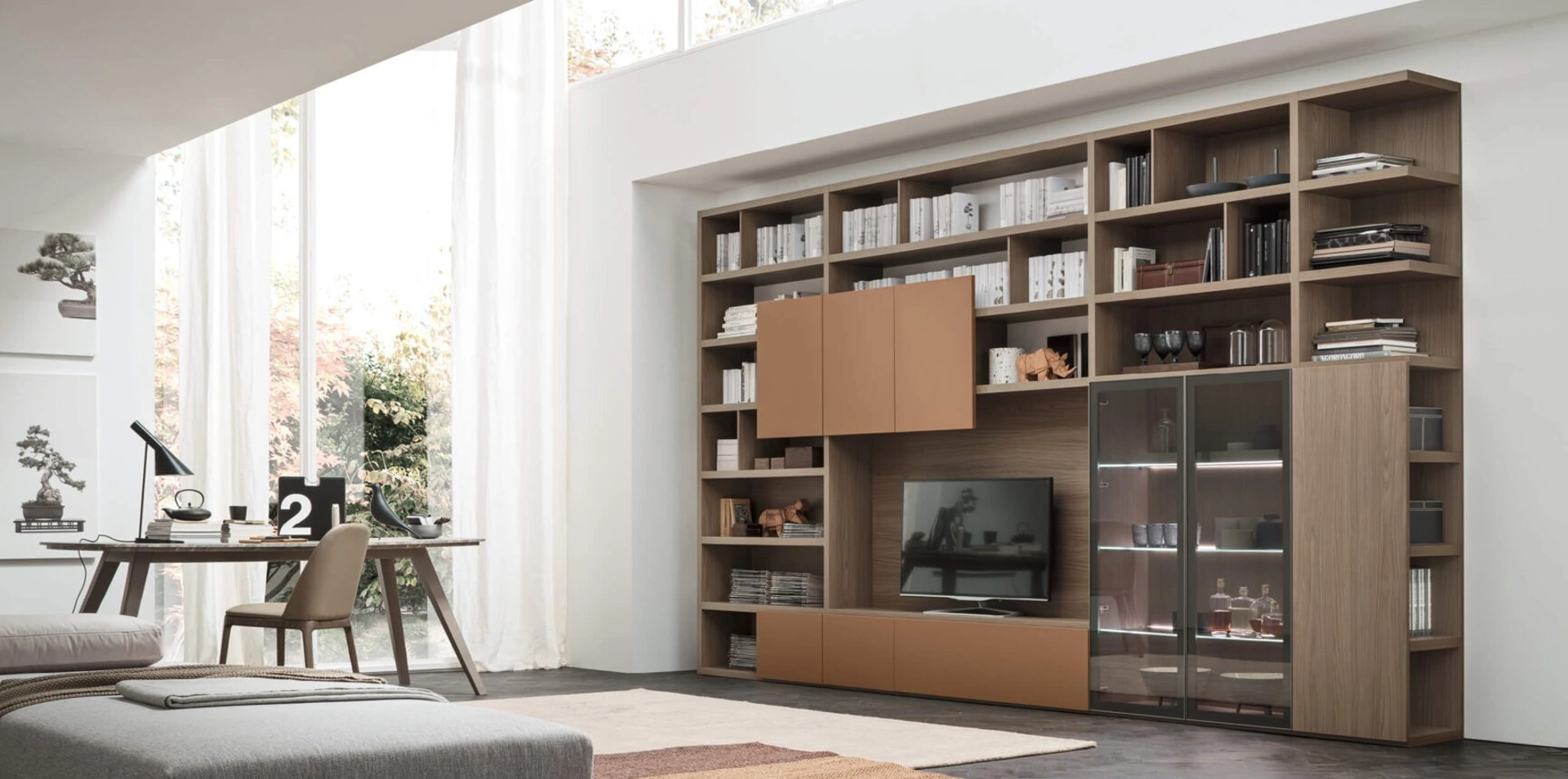 Anche in un soggiorno abbastanza piccolo, questo tipo di arredo riesce a organizzare al meglio gli spazi usufruendo al meglio di ogni angolo e garantendo componibilità su misura tipica delle soluzioni moderne. Questo modello costituisce tutta la qualità che il marchio assicura grazie a pluriennale professionalità e grande passione nel campo dell'arredo e del design. Un po’ librerie, un po’ mobili contenitori ed espositori: le Pareti Attrezzate sono ideali per organizzare un luogo pratico e operativo. La Parete Attrezzata Sistema Spalla Comp SA2204 di Maronese nella fotografia, realizzata in melaminico, risolve le più particolari problematiche abitative di spazio e stile senza rinunciare alla ricerca estetica.