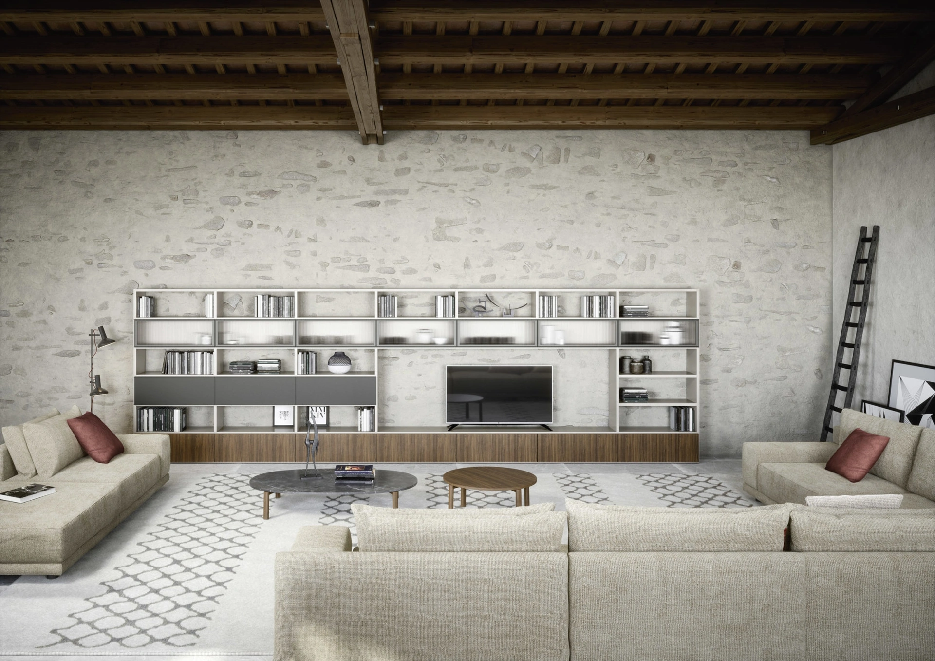 Anche in un soggiorno di dimensioni contenute, questo tipo di arredo riesce a ottimizzare gli spazi usufruendo al meglio di ogni angolo e assicurando componibilità personalizzabile tipica delle soluzioni moderne. Questa proposta costituisce tutta la qualità che il marchio assicura grazie a pluriennale esperienza e grande dedizione nel campo dell'arredo e del design. La Parete Attrezzata Wall 30 05 di Novamobili nella fotografia, con finitura in laccato opaco, risolve le più personali esigenze abitative di stile e spazio senza rinunciare alla ricerca estetica. Un po’ librerie, un po’ mobili contenitori ed espositori: le Pareti Attrezzate sono ideali per attrezzare un luogo pratico e operativo.