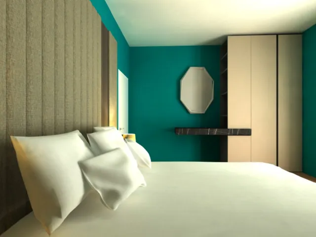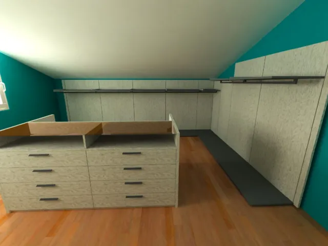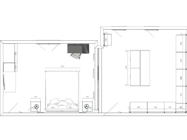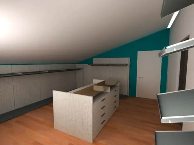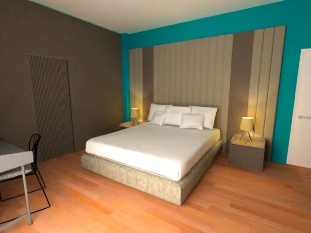 Progetto di un ambiente notte raffinato, composto da una camera da letto e una cabina armadio, collegati da una boiserie dogata che funge da parete divisoria. Questa elegante boiserie ospita una porta battente a filo, che permette di accedere facilmente ai due spazi. La scelta dei materiali e delle finiture crea un'atmosfera armoniosa e accogliente, ideale per un riposo rigenerante e un’organizzazione ottimale degli indumenti.