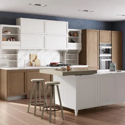 Sfruttare bene forma e dimensioni delle stanze oggi si può per merito della ricca serie di modelli con isola di stile tradizionale del noto e conosciuto marchio Lube. Le composizioni in legno come quella qui visibile regalano un grande vantaggio, quello di essere parecchio resistenti, eleganti e facili da pulire. Le Cucine Classiche sono pensate per assecondare tutte le problematiche abitative, possiedono linee essenziali che danno la possibilità di rendere i locali vivibili e un fascino senza tempo. Se per arredare la tua zona cucina cerchi una soluzione di pregio, solido negli anni e pratico, lasciati affascinare dalla Cucina classica Pantheon 07 di Lube.