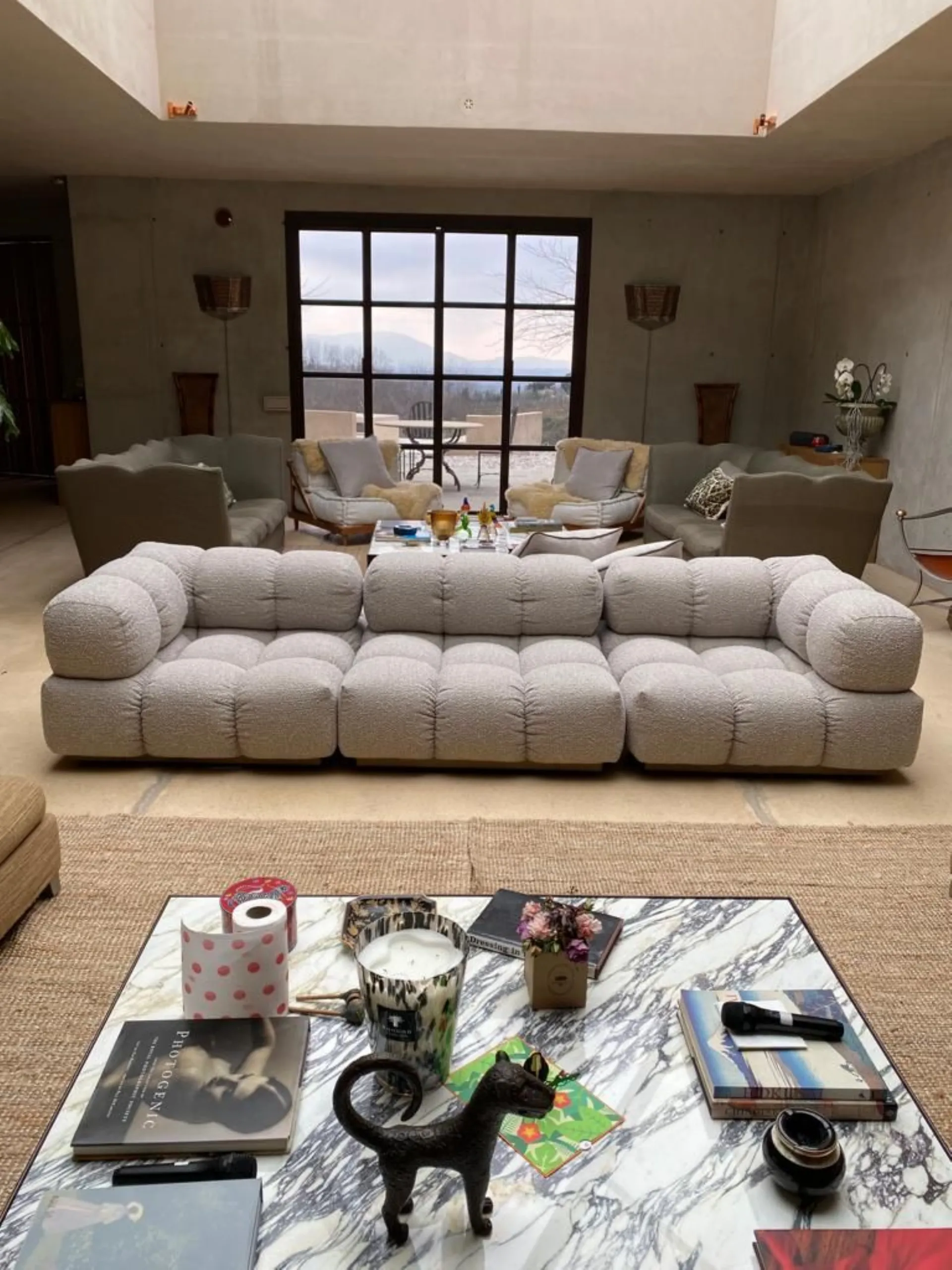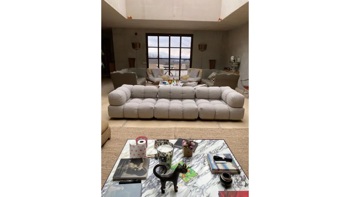 Spettacolare realizzazione a Capannoni in provincia di Lucca della composizione del salotto modello Sacai composto da poltrone angolo seduta squadrata, poltrona centrale grande, pouff rettangolare in tessuto universe 19 con base in metallo finitura ramato.