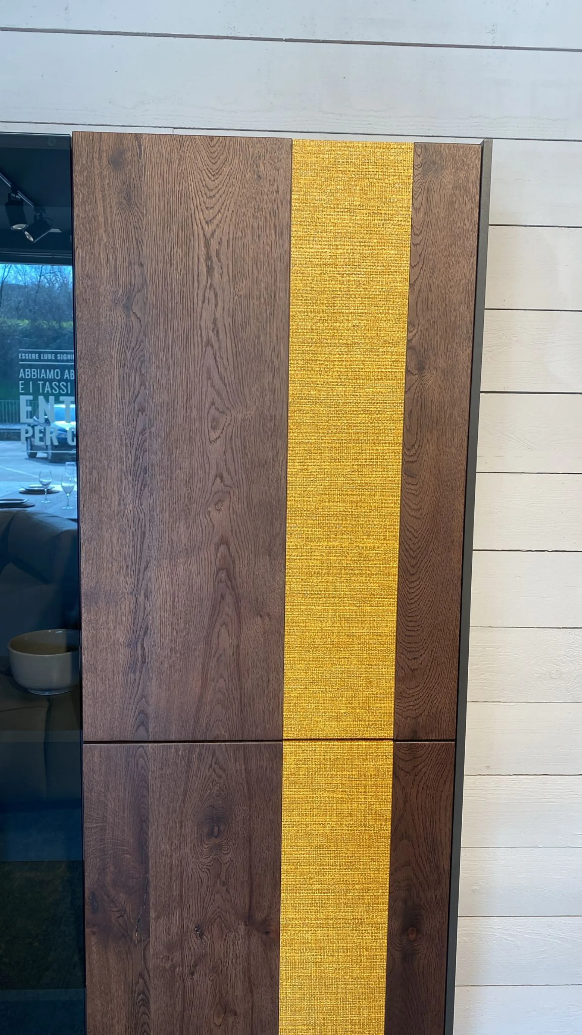 La vetrina Daisy Materico di Rivanova, le cui ante sono realizzate in legno massello di rovere, è caratterizzata due ante in legno e una anta in vetro per esporre i tuoi oggetti più preziosi. La finitura frontale in cerro arabica dona un tocco elegante e raffinato, mentre i piedini in ferro nero ral9005 raggrinzito conferiscono un tocco moderno e industriale. Il modello dei piedini a gamba hair rende la vetrina unica e originale. La scocca materico grigio antracite e la carta da parati a intreccio completano il look sofisticato e di tendenza. Disponibile per pronta consegna, donerà un tocco di stile e originalità al tuo ambiente.